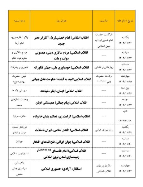 به گزارش پایگاه خبری شهید یاران، عناوین مصوب ایام الله دهه مبارک فجر و چهل و هفتمین سالگرد پیروزی شکوهمند انقلاب اسلامی، نماد عظمت و شکوه ملت بزرگ ایران اسلامی، جهت استحضار و بهره برداری منتشر شد.